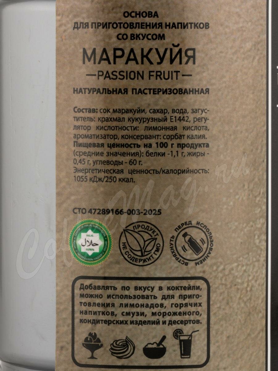 Состав: сок маракуйи, сахар, вода, крахмал кукурузный, лимонная кислота и др.
