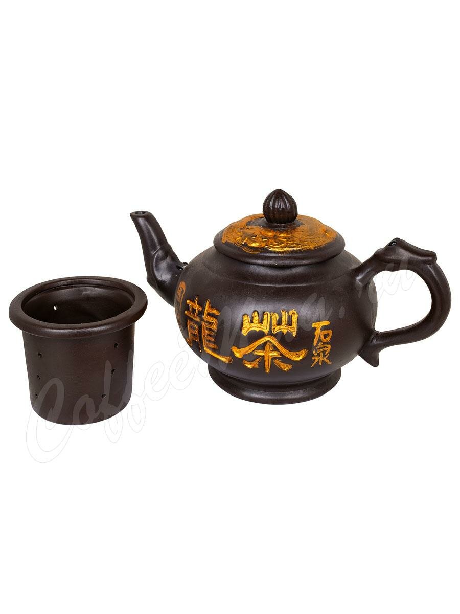 Чайник глиняный Надежда с заварочной колбой 600 мл, которая также выполняет роль ситечка, изготовлен из термоустойчивой глины, благодаря чему подходит для заваривания листовых видов чая и прессованного пуэра. Предмет домашней посуды может применяться во время аутентичных чайных церемоний, ведь он долго сохраняет температуру напитка и способствует раскрытию тончайших вкусоароматических оттенков любого сорта. Изделие в восточном стиле украшено иероглифами и золотистыми декоративными узорами. У него удобная широкая ручка, которая практически не нагревается в процессе использования.