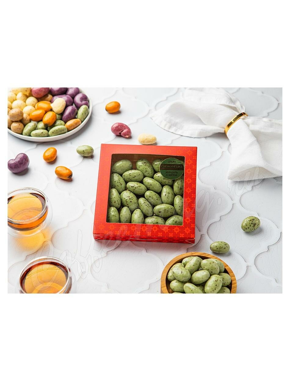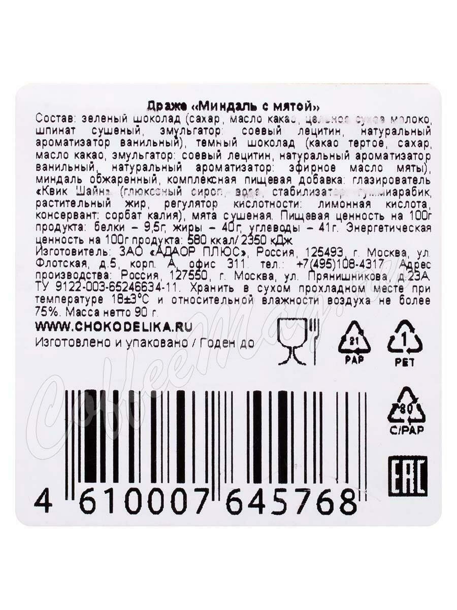 Драже Chokodelika Миндаль и мята 90 г - это изысканное лакомство, которое не оставит равнодушным ни одного гурмана. Оригинальные светло-зеленые конфеты вытянутой овальной формы покрыты аппетитной, хрустящей глазурью с приятным мятным вкусом и сладкими оттенками классической карамели. Внутри находится натуральный цельный миндаль, прошедший деликатную равномерную обжарку. Компактный бокс с драже окажется уместным подарком для друга, члена семьи и коллеги.