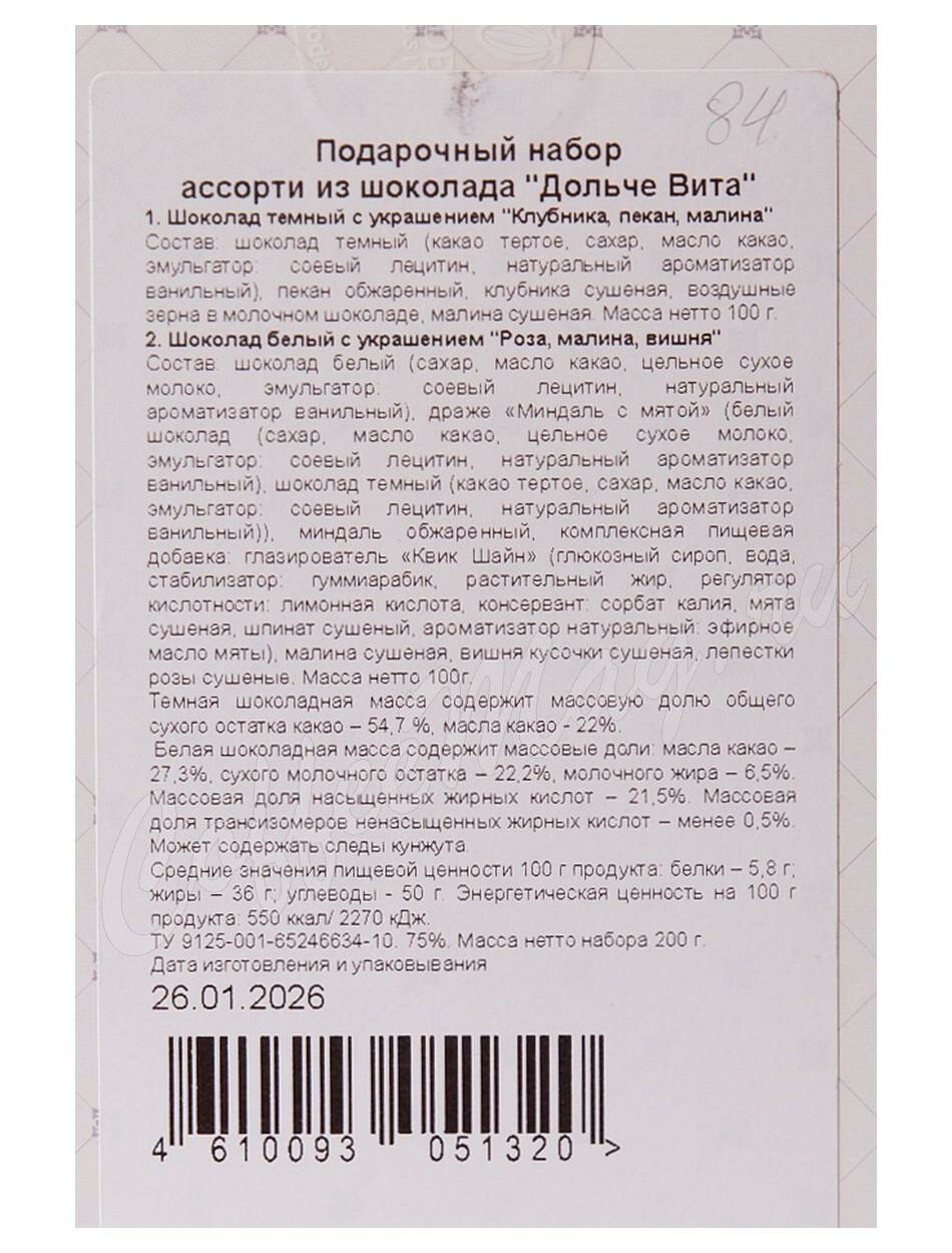 Погрузитесь в мир невероятной сладкой роскоши с подарочным набором эксклюзивного шоколада «Дольче Вита» - новинку 2024 года! «Дольче Вита» - представляет собой идеальное сочетание плиток темного и белого шоколада: Шоколад темный с украшением "Клубника, пекан, малина" и Шоколад белый с украшением "Роза, малина, вишня". Набор выдержан в лучших традициях мастеров кондитерского искусства и идеально подходит для тех, кто желает порадовать себя или близких особенным угощением. «Дольче вита» представлен в утонченной белой коробке с элегантным золотым тиснением и станет чудесным подарком особенному для вас человеку на любой праздник или просто так.
