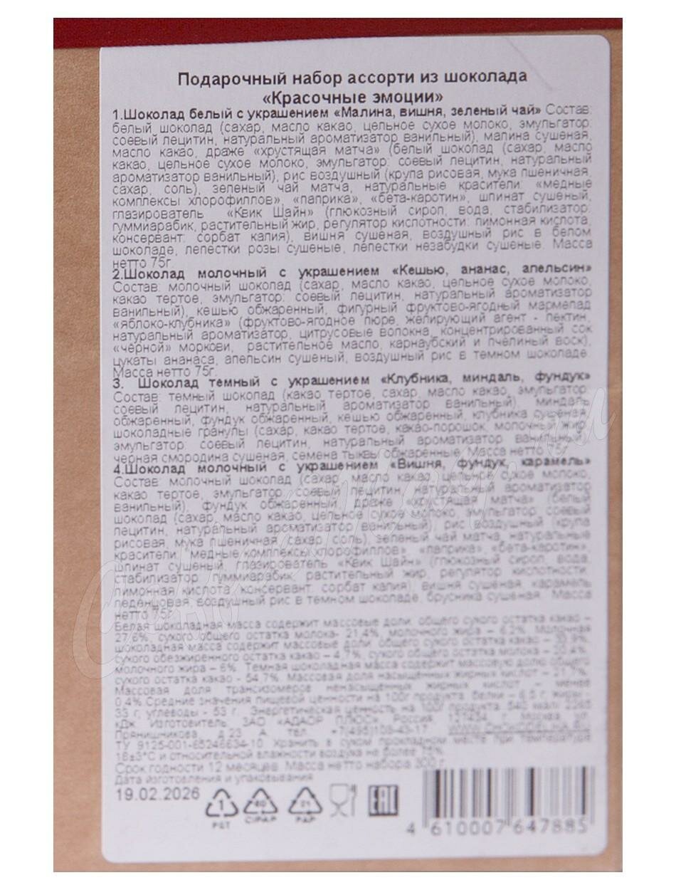 Состав набора: 1. Шоколад молочный с украшением "Вишня, фундук, карамель", 75 г Состав: молочный шоколад (сахар, масло какао, цельное сухое молоко, какао тертое, эмульгатор: соевый лецитин, натуральный ароматизатор ванильный), фундук обжаренный, вишня сушеная, карамель леденцовая, воздушный рис в темном шоколаде, брусника сушеная.