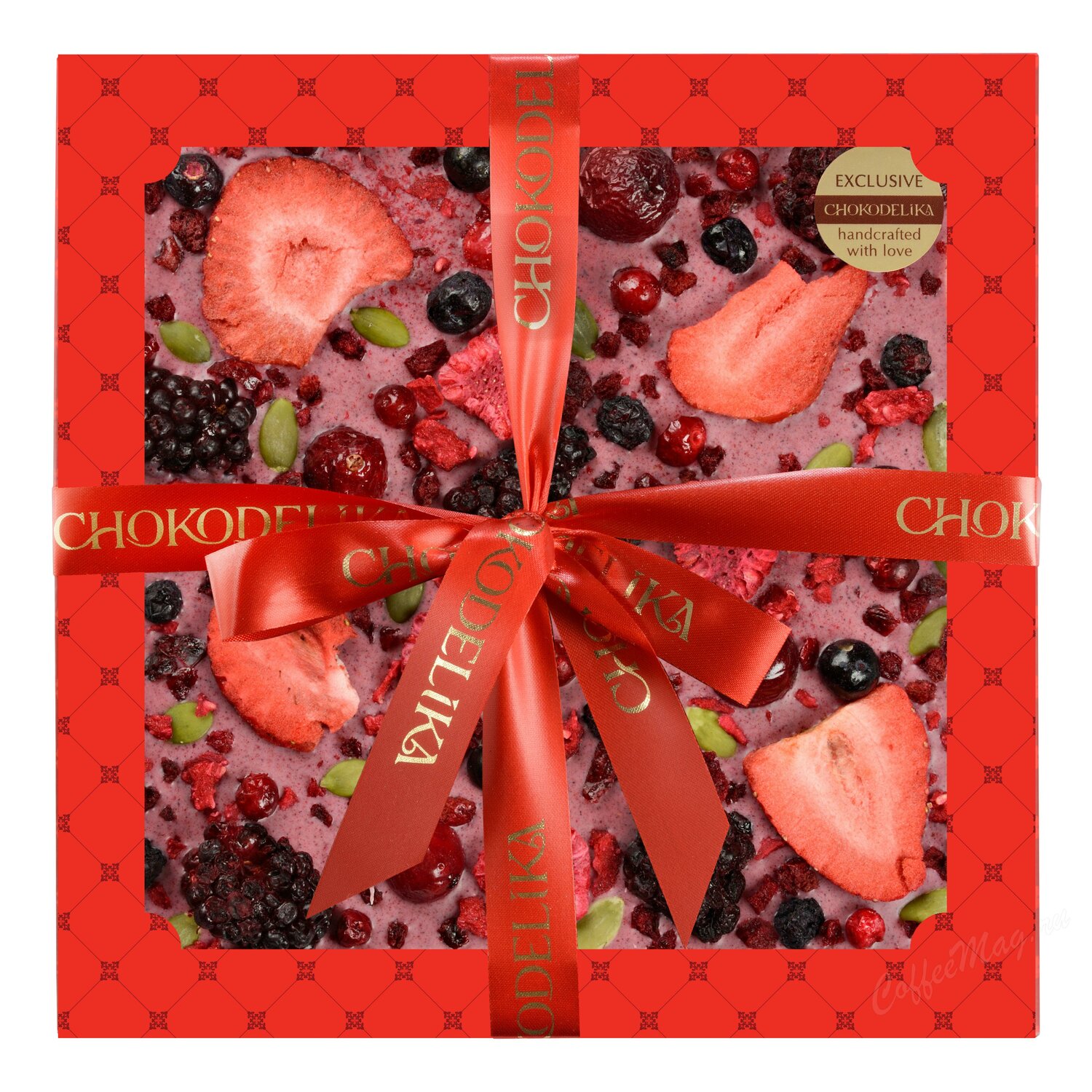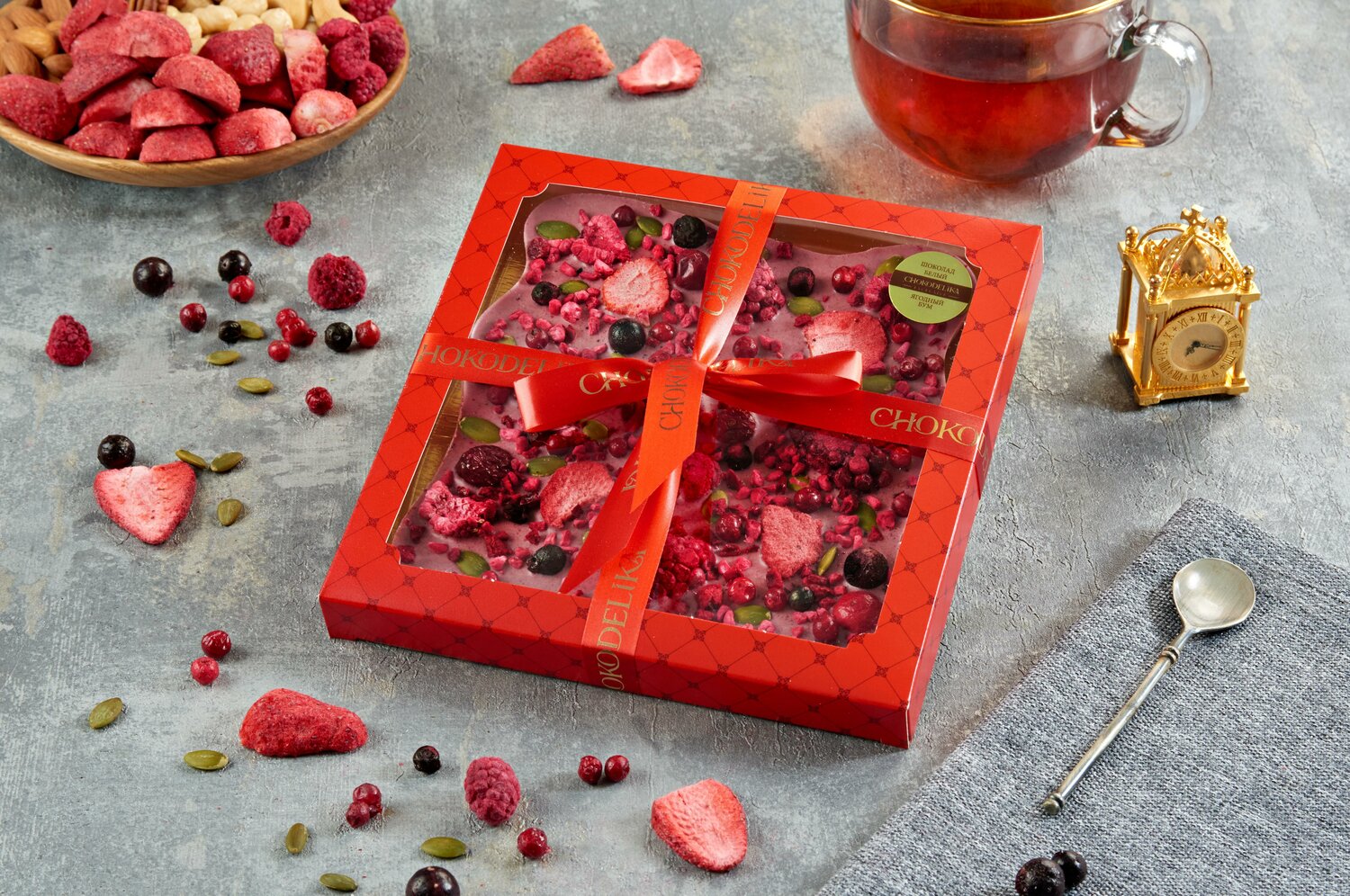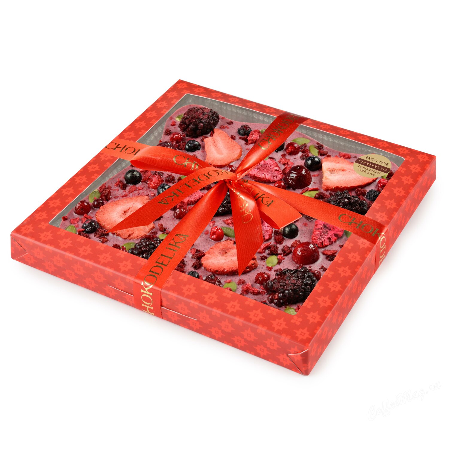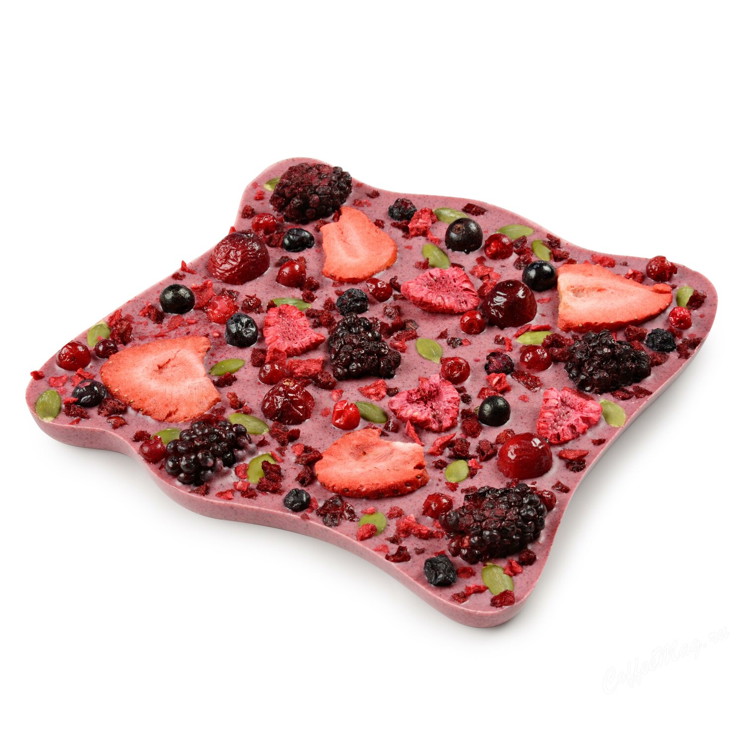- Состав: белый шоколад (сахарный песок, какао-масло, сухое цельное молоко, натуральный аромат ванили), сушеные ягоды малины, брусники, ежевики, клубники, черной смородины, клюквы, голубики, черники, обжаренные семена тыквы и др.