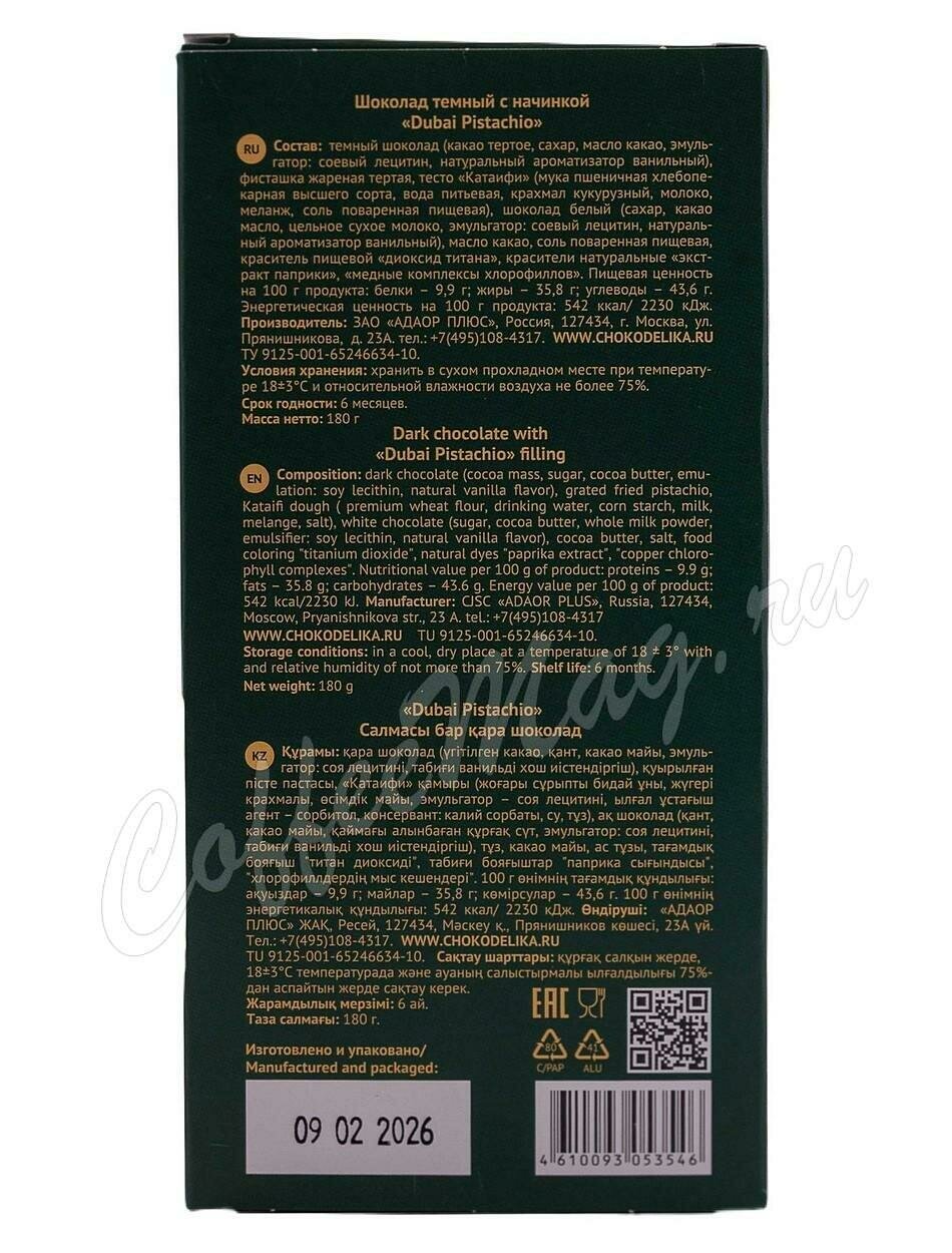 Chokodelika Шоколад темный Дубайский Dubai Pistachio 180 г — десерт с выразительным вкусом и сложной текстурой. Основа выполнена из качественного шоколада на базе бельгийского сырья Puratos, известного сбалансированным составом и натуральностью. В составе также присутствуют молочный и белый шоколад, что смягчает вкус и придаёт кремовую структуру. Начинка включает пасту из жареных фисташек и хрустящее тесто катаифи, создающее контраст мягкости и лёгкого хруста. Вкус раскрывается слоями: сначала ощущается насыщенность какао, затем карамельные и сливочные оттенки, далее проявляются ореховые ноты. Используются натуральные красители, такие как хлорофилл и бета-каротин. Продукт не содержит пальмового масла, искусственных добавок и ГМО. Подходит к кофе, чаю, десертным винам, а также сочетается с фруктами, сырами и орехами.