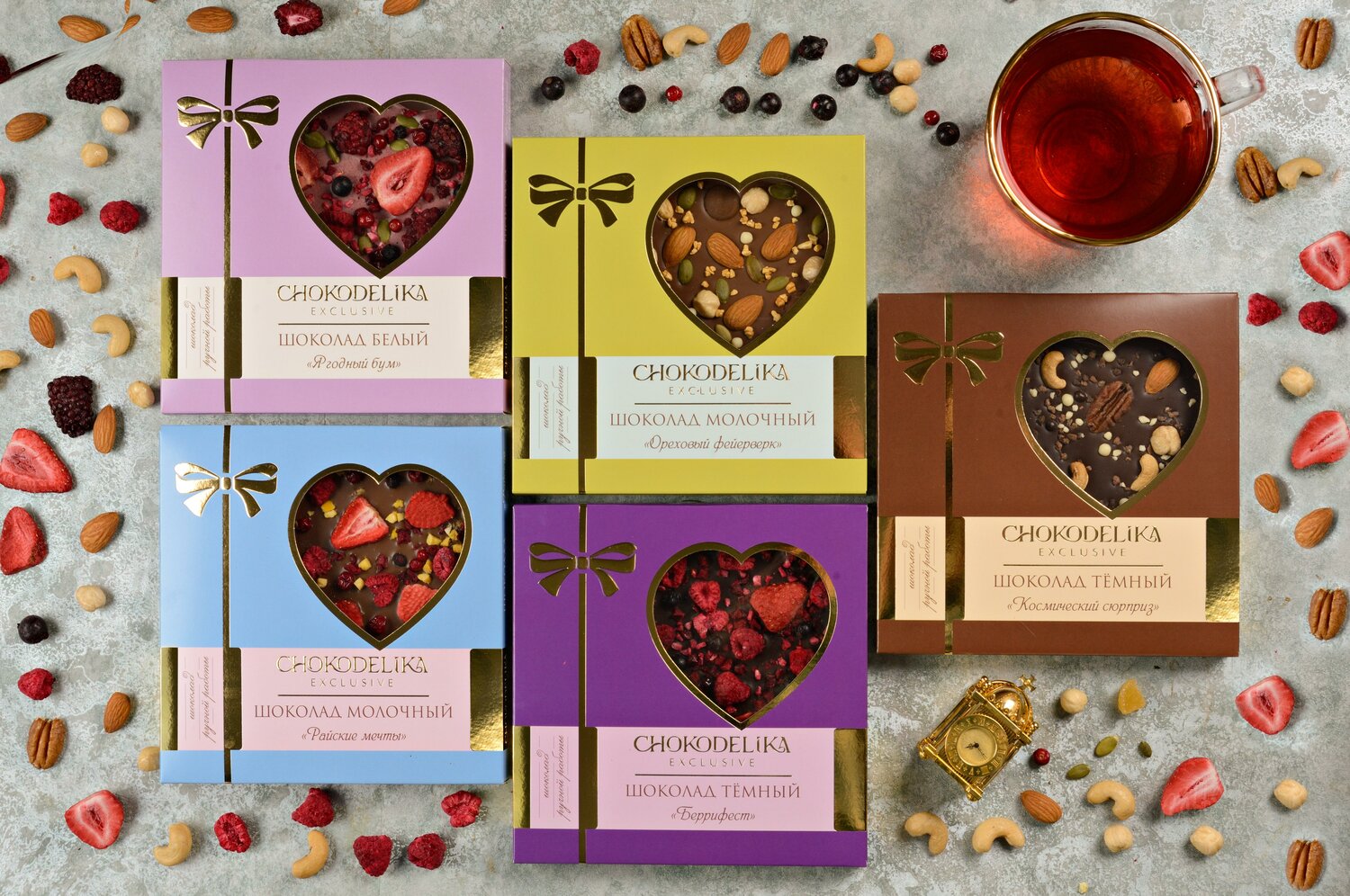 - Состав: темный шоколад (какао тертое, сахар, масло какао, эмульгатор: соевый лецитин, натуральный ароматизатор ванильный), обжаренные ядра орехов (пекан, фундук, кешью, миндаль), воздушный рис в молочном, темном и белом шоколаде, крошка из белого, молочного и темного шоколада.