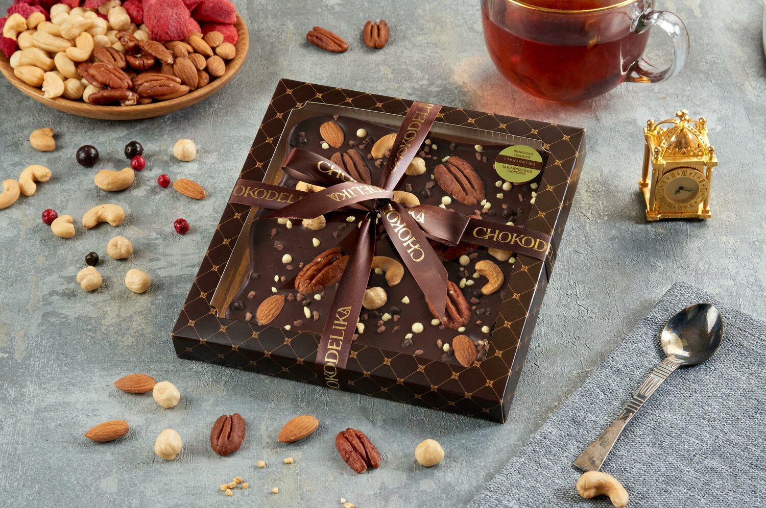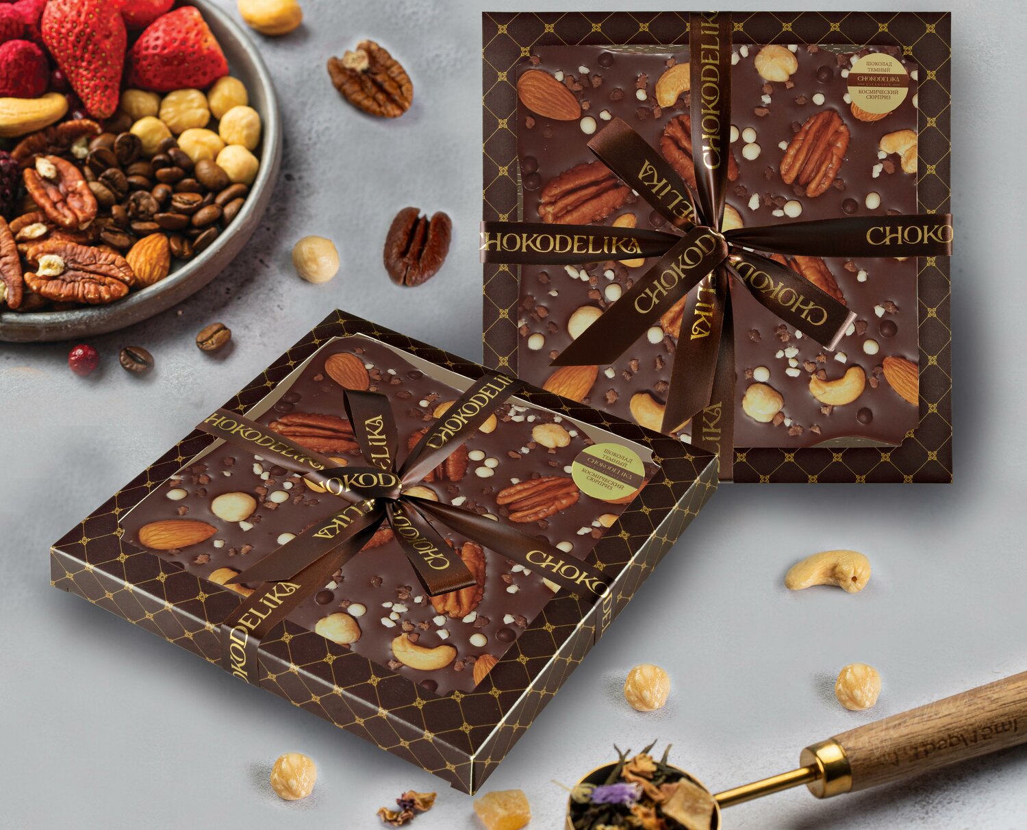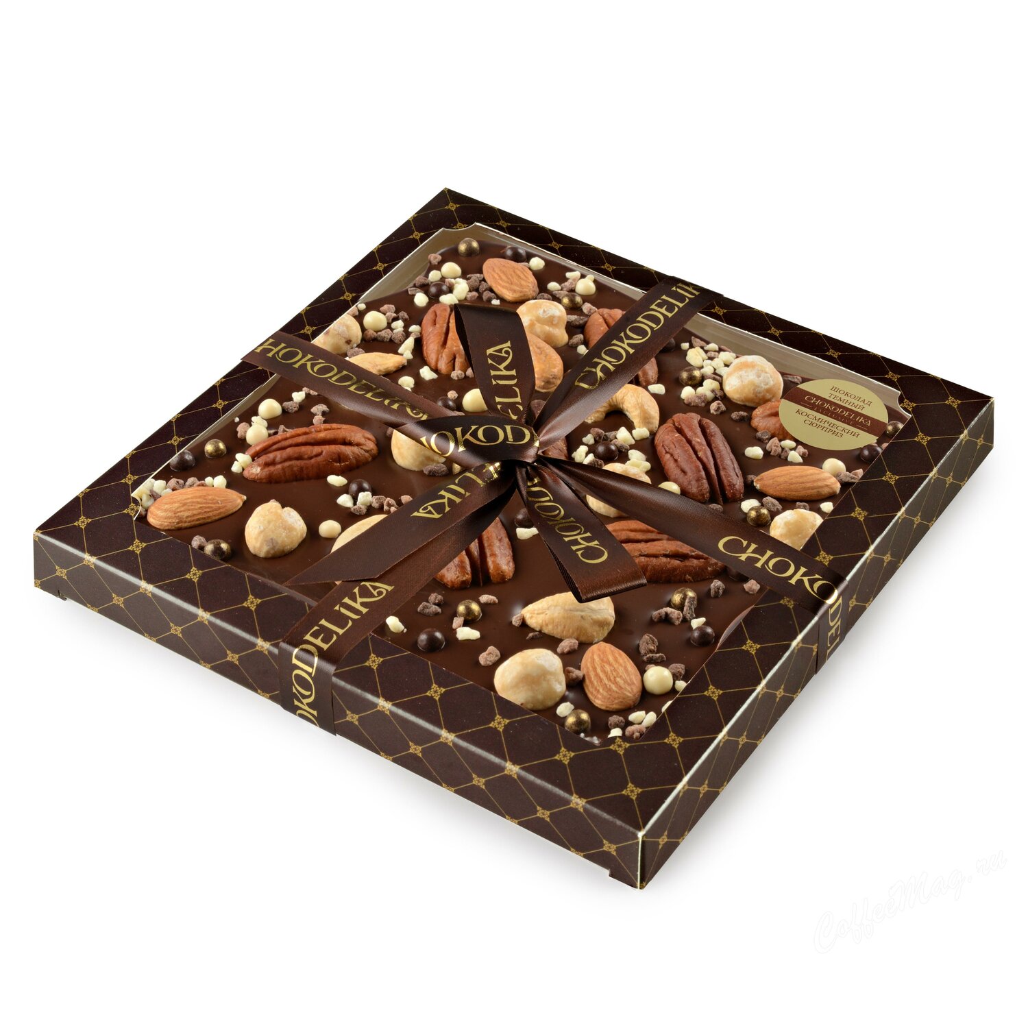 - Состав: тертое какао, масло какао, лецитин, обжаренные ядра пекана, фундука, миндаля и кешью, воздушный рис в белом, молочном и темном шоколаде, крошка из белого, молочного и темного шоколада, натуральный аромат ванили и др.