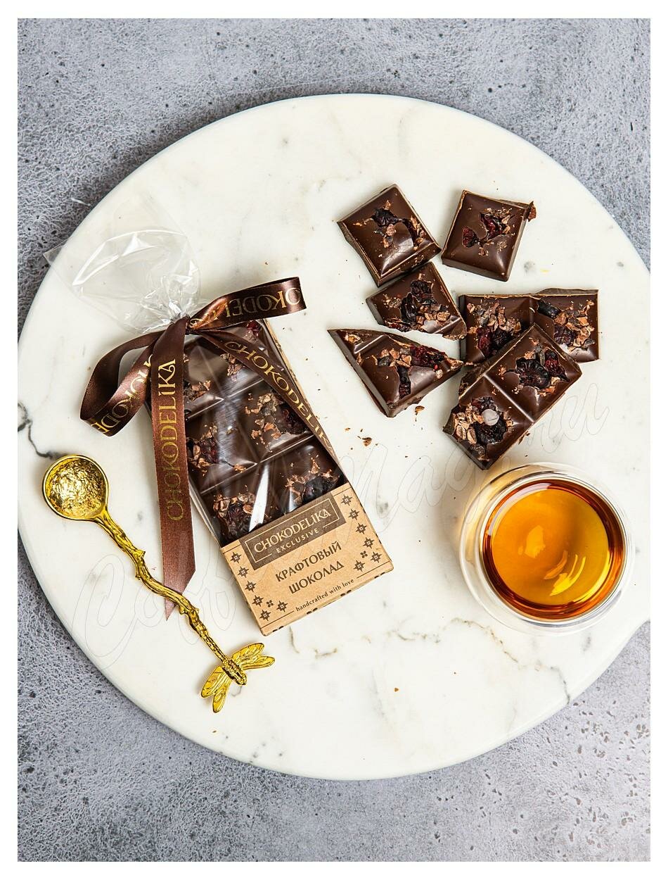 Chokodelika Шоколад темный "Крафтовый микс с клюквой" 50 г - это настоящий гастрономический шедевр, способный покорить сердца любителей шоколада. Основой изысканного деликатеса является темный шоколад высочайшего качества, созданный с использованием отборных какао-бобов, который сногсшибательно сочетается с горьковатой ноткой ягод. Декор из вяленой клюквы придает шоколаду особую элегантность и привлекательность, а дробленые какао-бобы добавляют текстуру и интригующий хруст. Этот шоколад идеально сочетается с чашкой ароматного кофе или чая, подчеркивая их неповторимый вкус. Он станет прекрасным дополнением к вечернему чаепитию или отличным подарком для тех, кого вы хотите порадовать и удивить.
