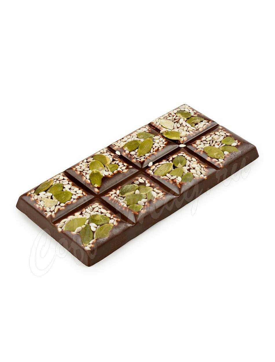 В основе этого угощения - темный шоколад, который обладает глубоким и насыщенным вкусом. Богатый аромат и нежная текстура делают его настоящим наслаждением для всех ценителей шоколада. Декорированный кунжутом и тыквенными семечками, благодаря им он становится обладателем уникального вкусового акцента: кунжут, с его легким ореховым ароматом, придает шоколаду легкость и глубину вкуса, а нежные тыквенные семечки - неповторимую хрустящую текстуру.