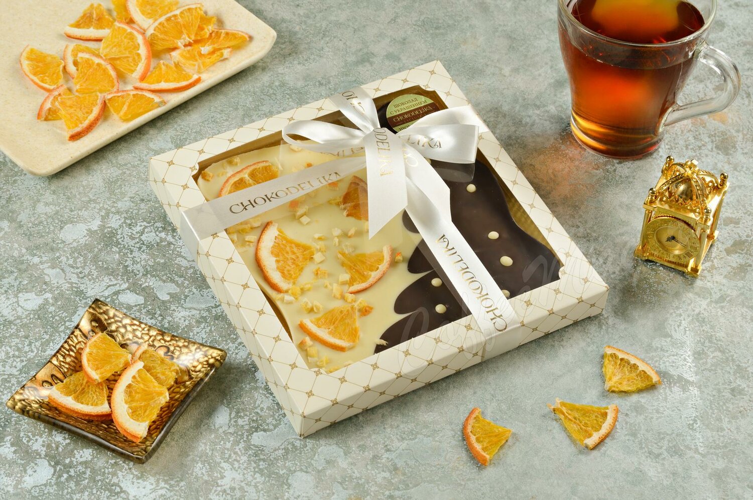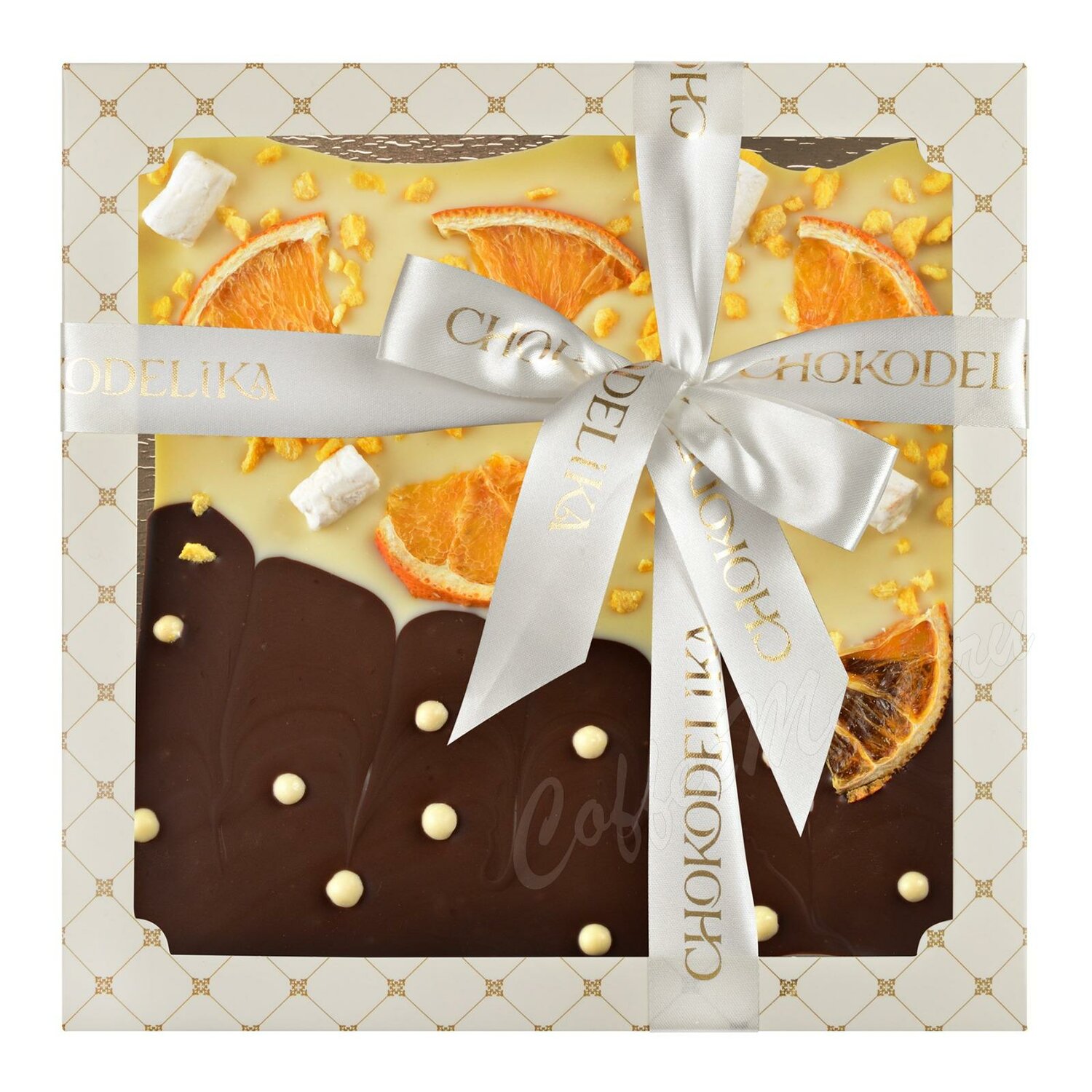 Chokodelika Шоколад темный "Шоколадный дуэт" 200 г – замечательный подарок, который по достоинству оценит любой поклонник изысканных десертов. Такого вы точно еще не пробовали! Можно приобрести большую плитку для себя, а можно выбрать в качестве подарка для родных и близких. Подарочный крафтовый шоколад красиво упакован и перевязан лентой. Одна сторона десерта — это белый шоколад с апельсиновыми цукатами и зефиром, а другая — темный шоколад с воздушным глазурованным рисом. Одна плитка — два разных вкуса. Яркие, неповторимые и приятные впечатления от дегустации гарантированы!