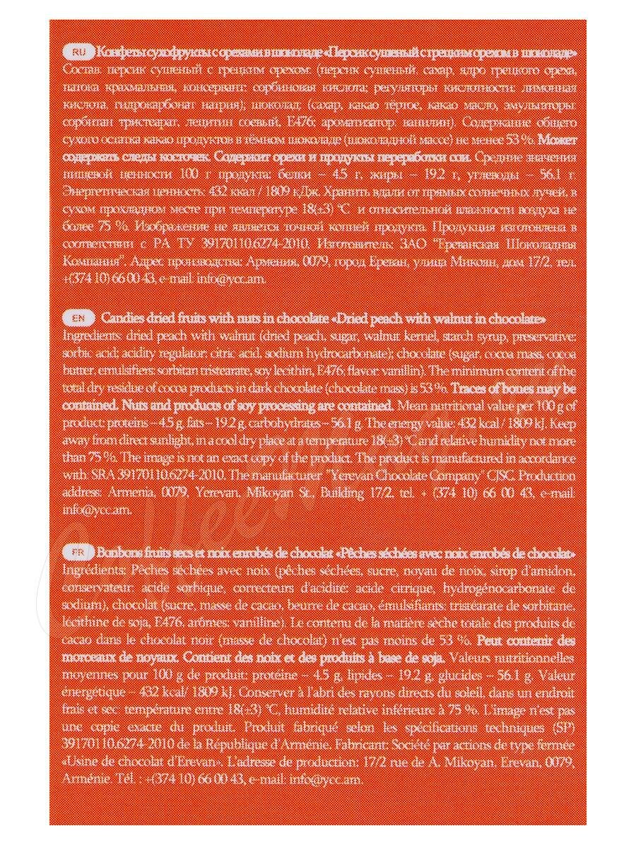 Состав: персик сушеный, ядро грецкого ореха, сахар, патока крахмальная, лимонная кислота, какао тертое, какао-порошок, какао масло, лецитин соевый, аромат ванили.