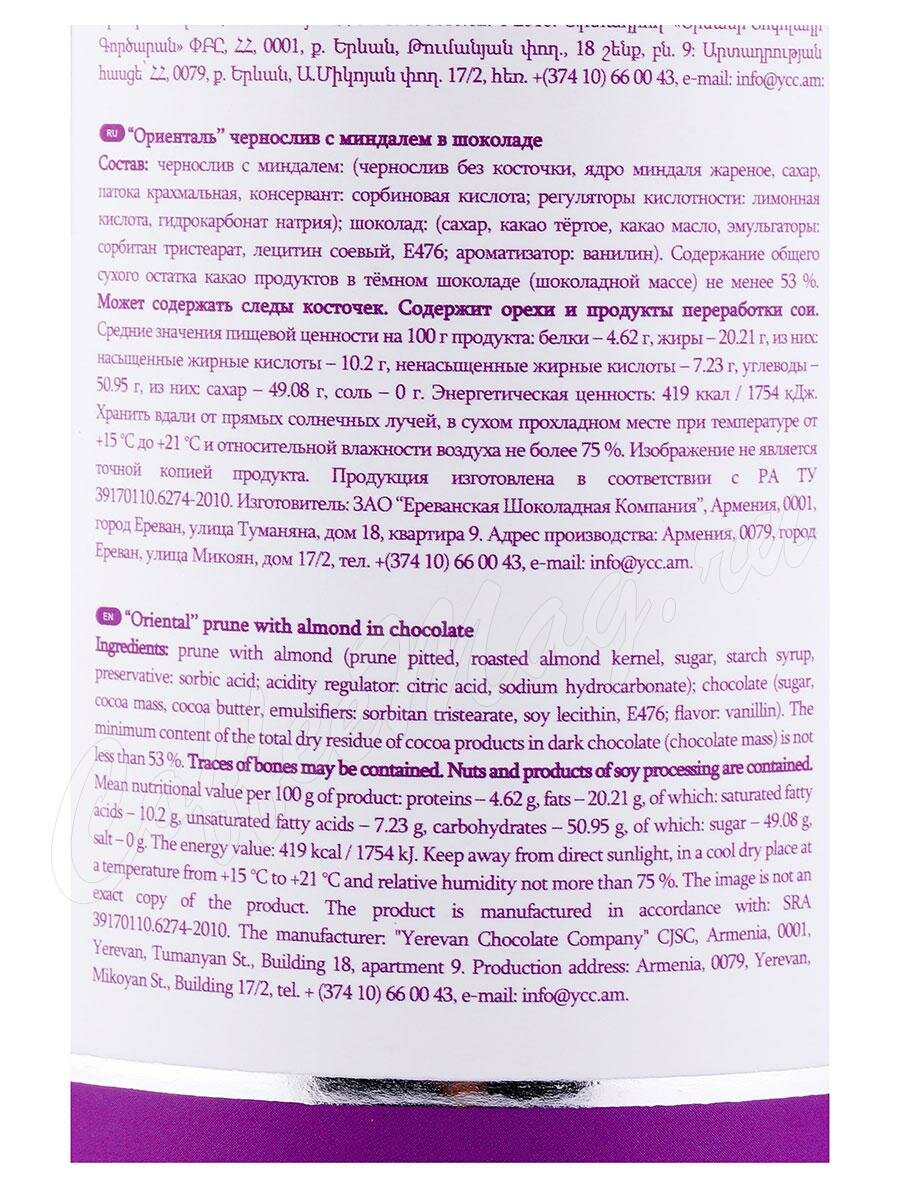 Состав: чернослив, ядро миндаля жареное, сахар, патока, лимонная кислота, какао тертое, какао-порошок, какао масло, лецитин соевый, ванилин и др.