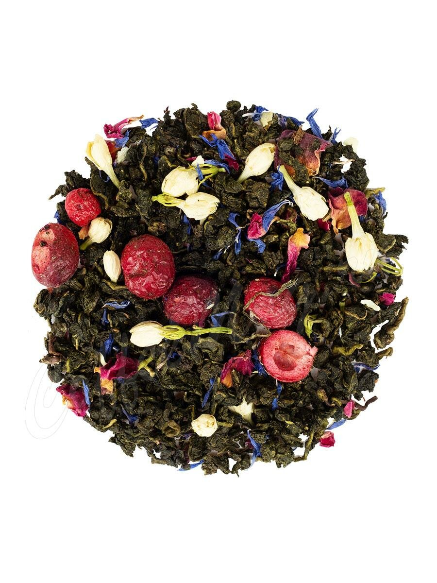 Состав: китайский полуферментированный улун, сушеная клюква, цветы жасмина, лепестки розы и василька, ароматы специй и цветов.